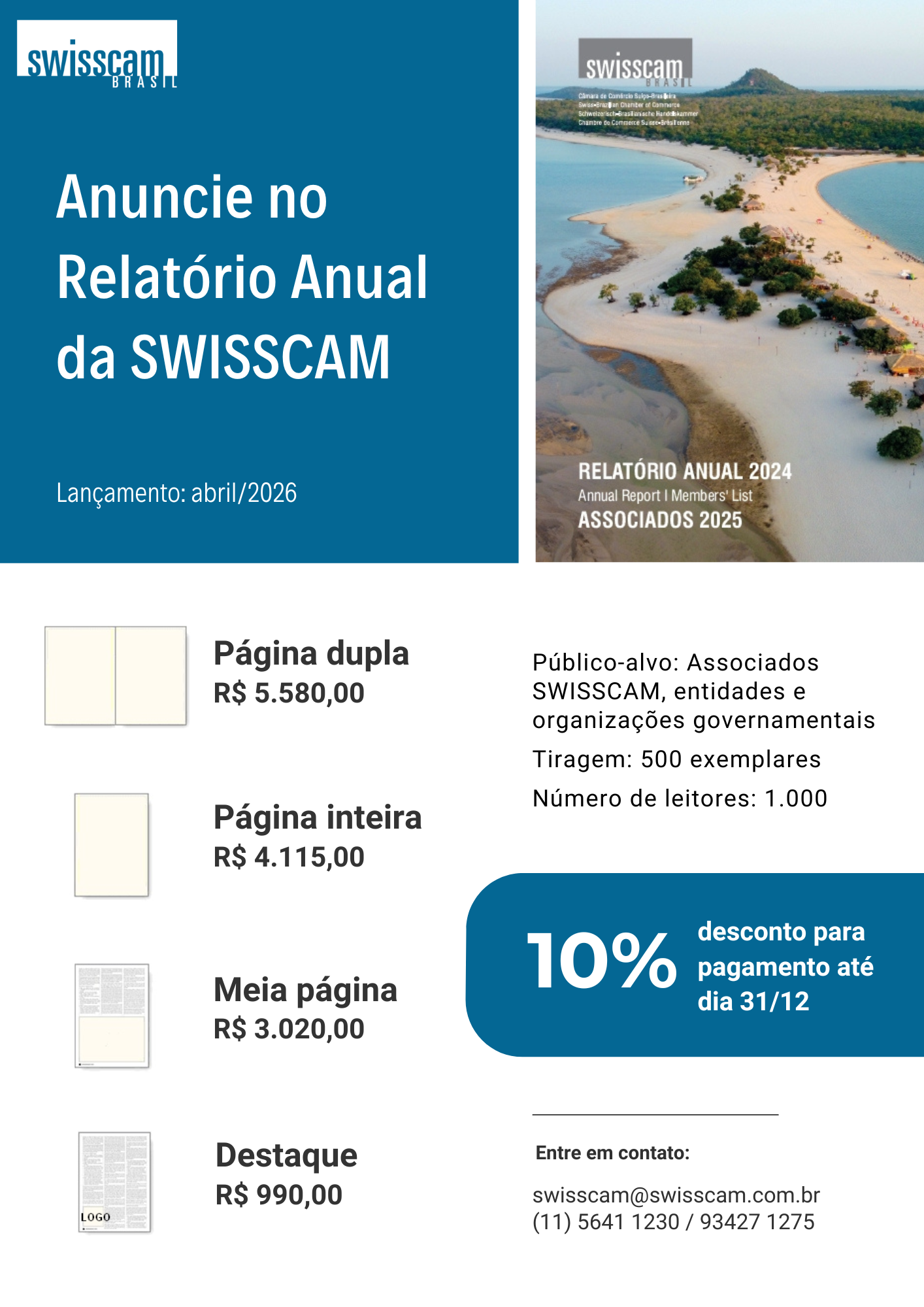 A publicação será distribuída em abril, exclusivamente aos tomadores de decisões dos nossos associados e entidades no Brasil e na Suíça. Além da versão impressa, o Relatório Anual em versão online ficará disponível na área restrita do site da SWISSCAM.