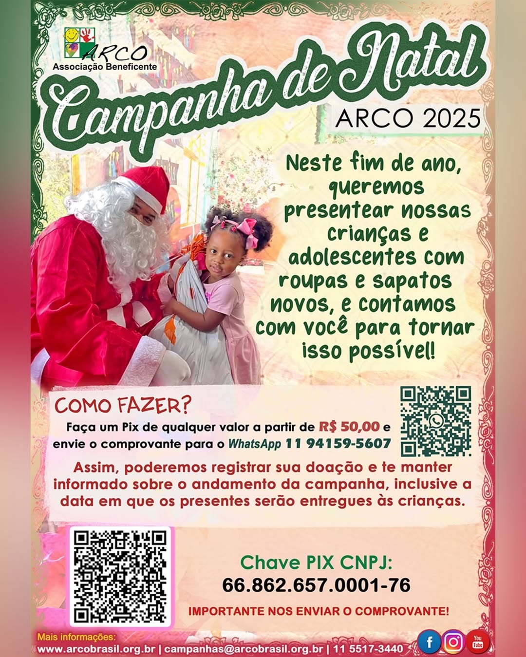 Como contribuir: Faça um Pix de qualquer valor a partir de R$50,00 e envie o comprovante para o WhatsApp (11) 94159 5607. ARCO Associação Beneficente Chave PIX: 66.862.657.0001-76