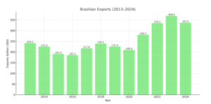 In 2024, exports and imports represented 33,3 percent of Brazil’s GDP, with exports accounting for 18,5 percent. This performance was mainly driven by the export of commodities such as oil, soybeans, iron ore, and beef.