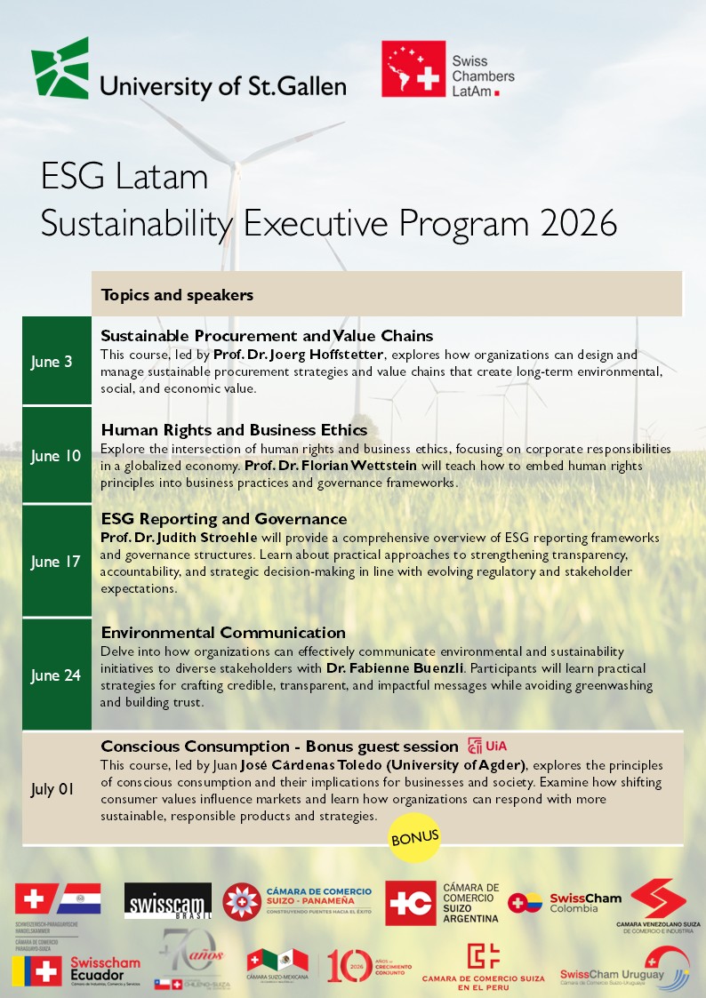 Após o grande sucesso da primeira edição, o Programa ESG Latam 2026, realizado pela Universidade de St. Gallen (HSG), em colaboração com as câmaras suíças na América Latina, traz insights novos e atualizados, além de perspectivas regionais, para os líderes de ESG da atualidade.