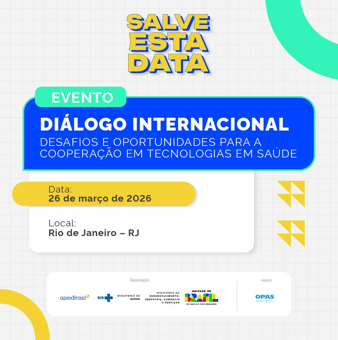 No próximo 26 de março de 2026, o Ministério da Saúde (MS) em parceria com a Agência Brasileira de Promoção de Exportações e Investimentos (ApexBrasil) e apoio da Organização Pan-Americana da Saúde (OPAS/OMS), promoverá o Diálogo Internacional – Desafios e Oportunidades para a Cooperação em Tecnologias em Saúde, no Windsor Convention & Expo Center, na Barra da Tijuca, no Rio de Janeiro, encontro que reunirá autoridades, especialistas e representantes do setor produtivo do Brasil e de países parceiros para discutir caminhos de cooperação em áreas estratégicas da saúde.