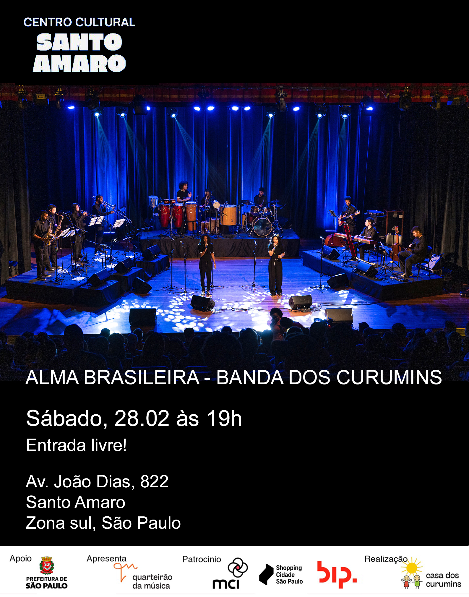 A Casa dos Curumins, associada da SWISSCAM, convida a todos prestigiarem o primeiro show do ano da Banda dos Curumins. A Banda se apresenta no palco do Centro Cultural Santo Amaro – SP com o projeto “Sons do Brasil”, um espetáculo que celebra o álbum Alma Brasileira. O show expressa um desejo ardente de beleza e transmite uma mensagem de esperança e alegria que ilumina o coração