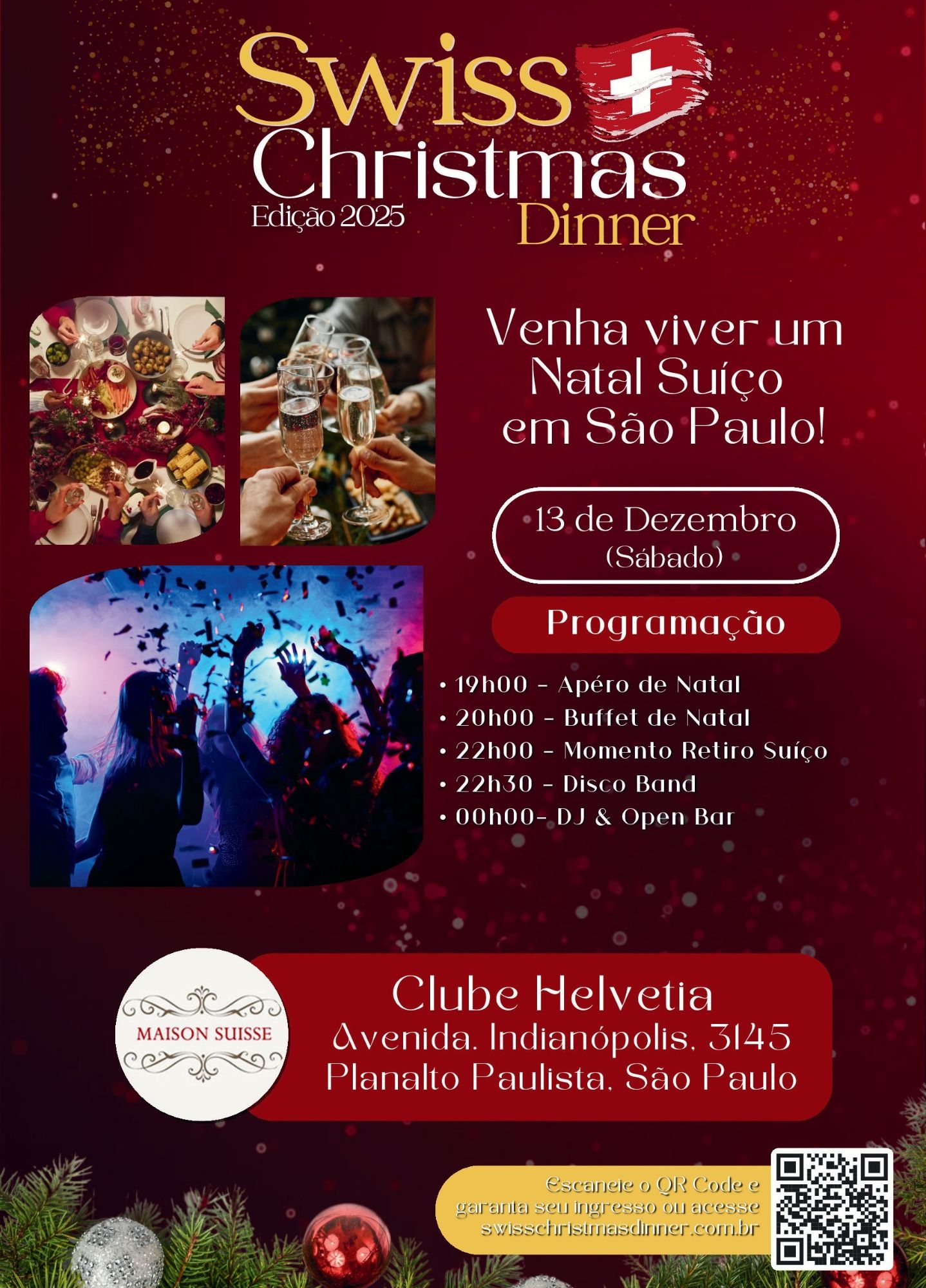 Entrada: Adquira o seu ingresso através do QRCode na imagem ou pelo site www.swisschristmasdinner.com.br