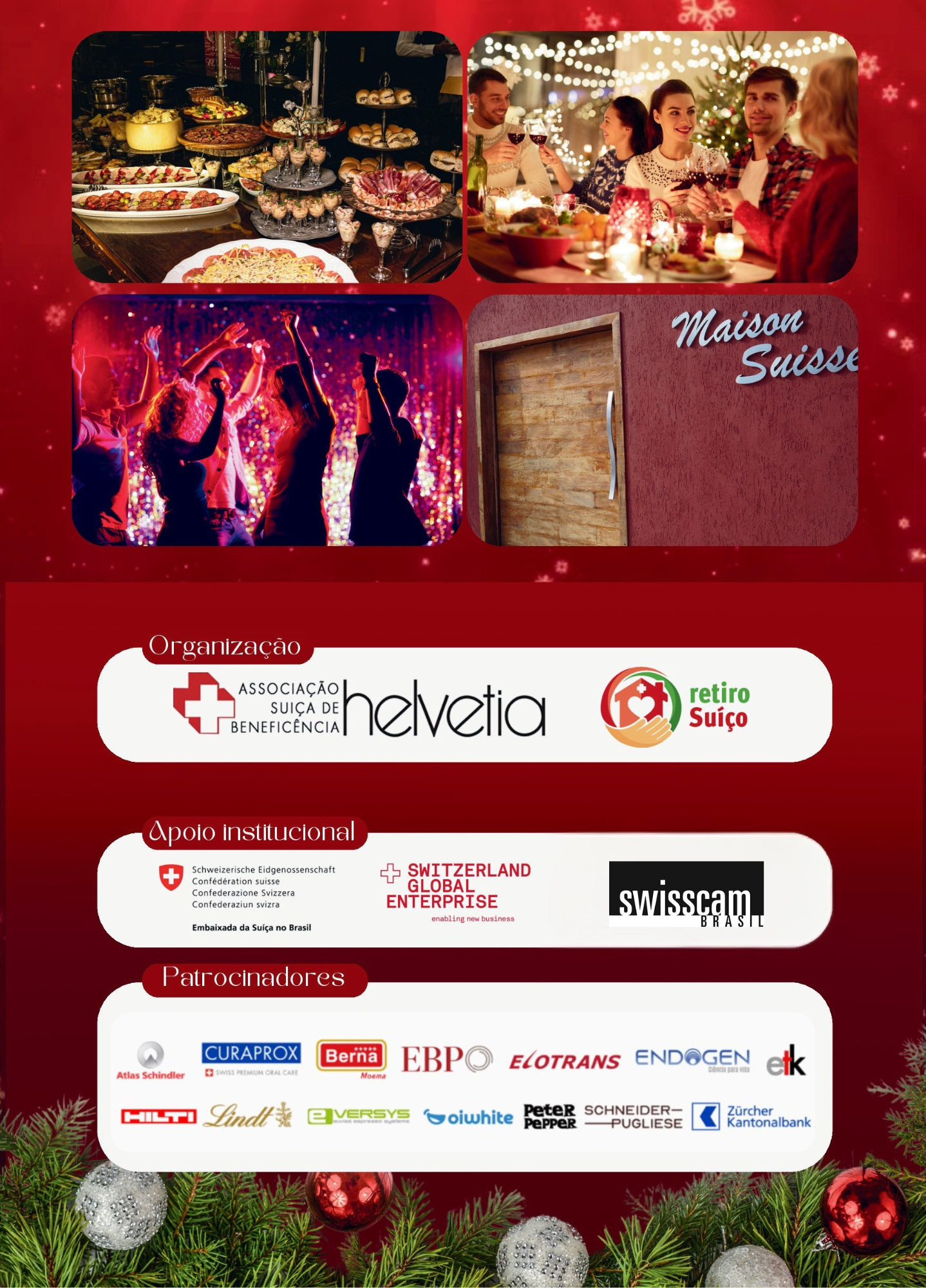 A Associação Suíça de Beneficência Helvetia e o Retiro Suíço convidam todos a participar do Swiss Christmas Dinner, no dia 13 de dezembro, no Maison Suisse, em São Paulo.