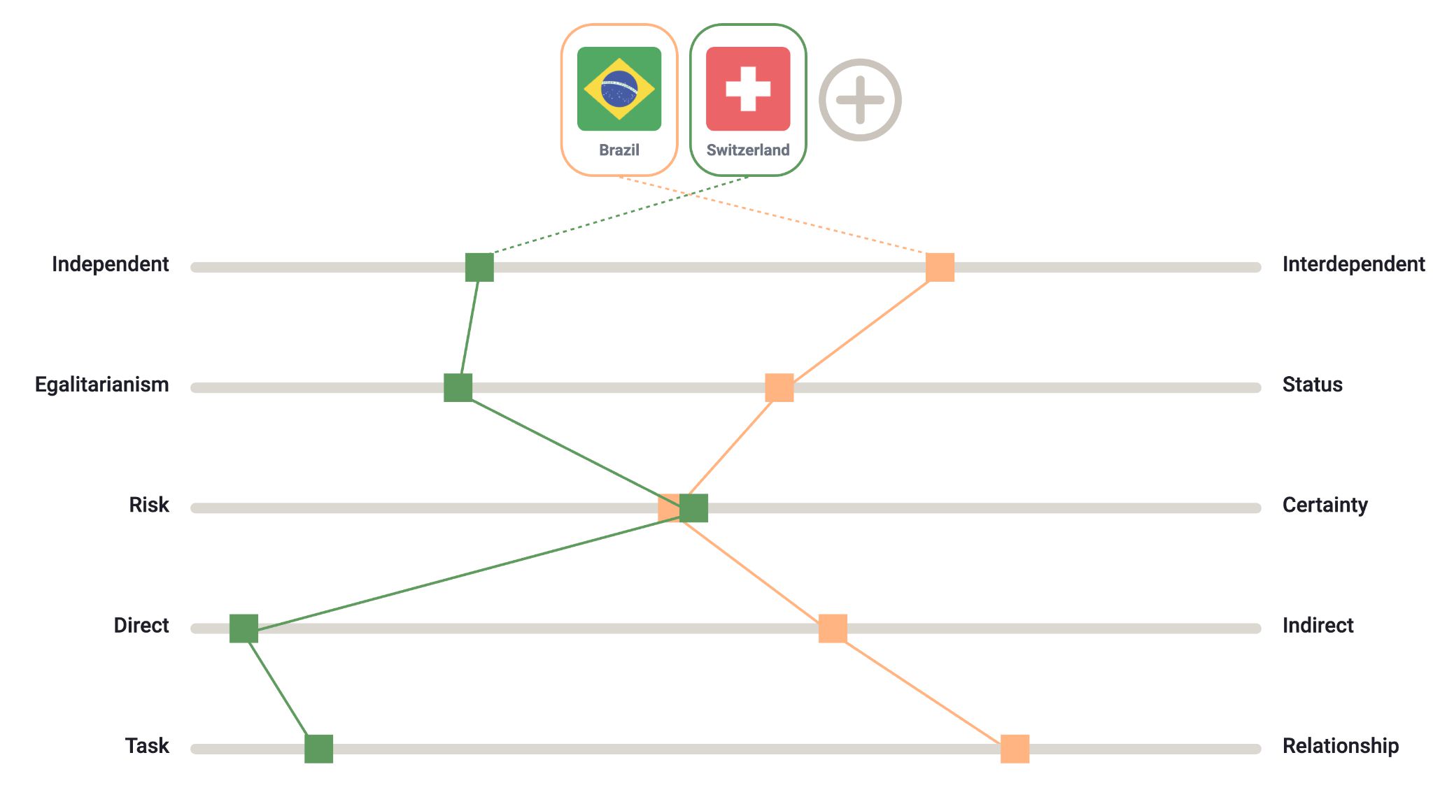 A primeira dimensão mostra que as pessoas da Suíça tendem a tomar decisões de forma mais independente, valorizando a autonomia como uma competência importante e como parte da identidade individual. No Brasil, em contraste, a identidade está mais ligada ao grupo, e as decisões são geralmente tomadas coletivamente a fim de preservar a harmonia e a cooperação. Se você tomar decisões sozinho no Brasil, poderá ser percebido como alguém que não valoriza o grupo ou como excessivamente individualista. Dependendo da cultura corporativa, esse tipo de comportamento pode levar à exclusão de decisões de diferentes grupos, de conversas informais ou de eventos sociais. Embora a tomada de decisão interdependente possa exigir mais tempo, conversas e reuniões, no contexto brasileiro, pode ser mais eficaz na geração de engajamento da equipe e colaboração entre colegas-chave. Em muitos casos, você, na verdade, ganhará velocidade se você dedicar tempo para consultar as pessoas, pedir suas opiniões e envolver os atores-chave.